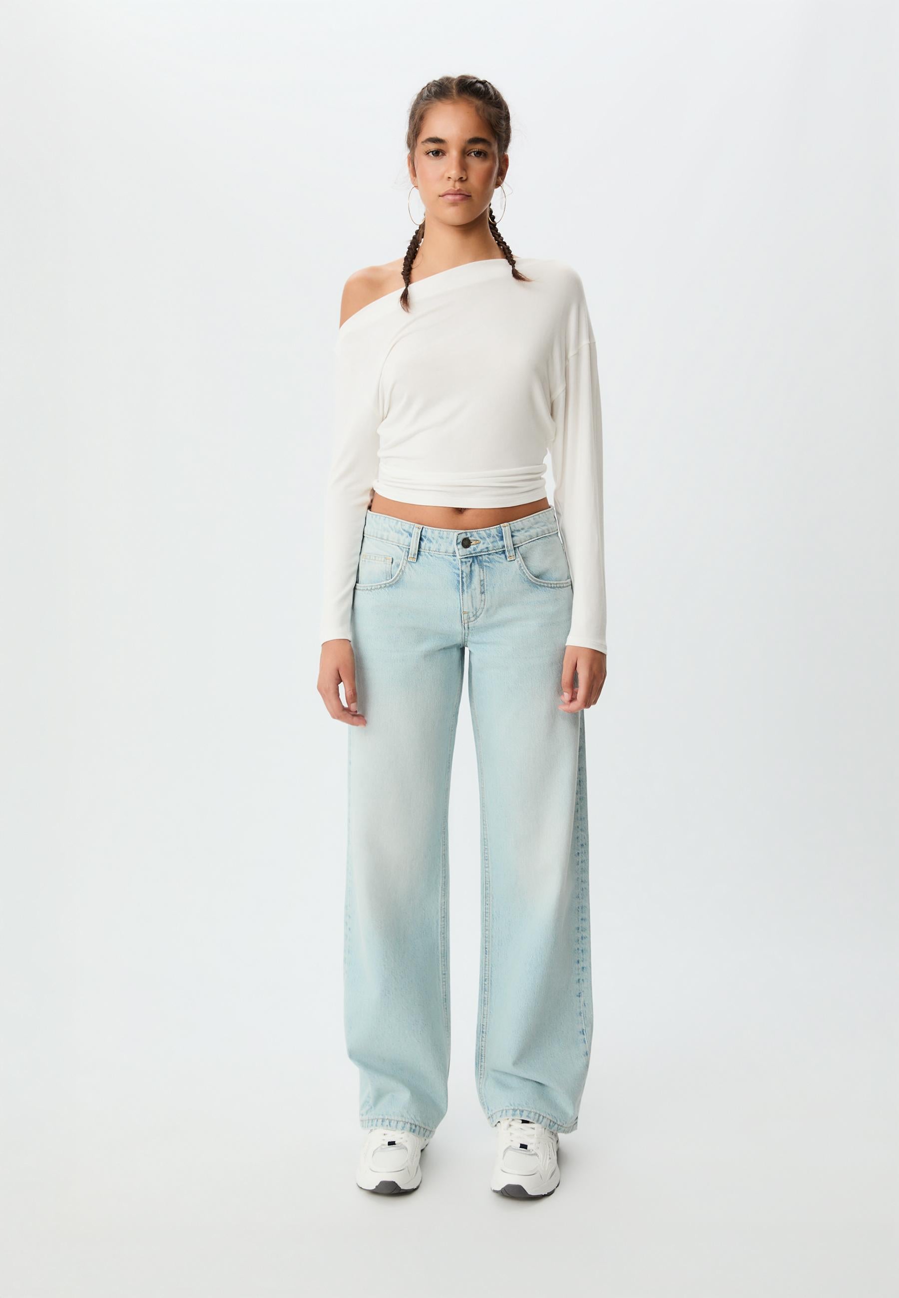 Machine wash cold (20°C) inside out with similar colours. Do not use chlorine bleach. Indigo may bleed when dry or wet. Stretch inseams gently while damp. Iron on low heat. Do not tumble dry. Dry clean if necessary.